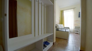 Номер стандарт покращений – це велика простора кімната з невеликим передпокоєм, розміщеним в ньому вішаком для верхнього одягу і тумбою для взуття.